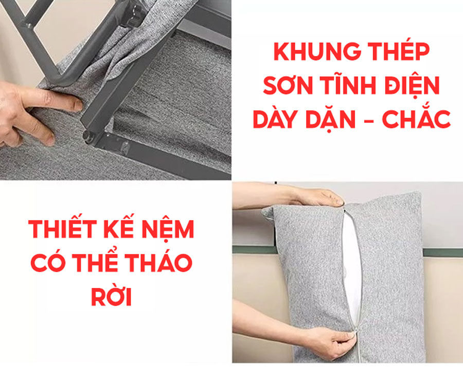- Khung giường làm bằng thép carbon chất lượng cao sơn tĩnh điện siêu đẹp. Đảm bảo độ bền và an toàn cho người sử dụng. Vải bọc tháo giặt vệ sinh dễ dàng.