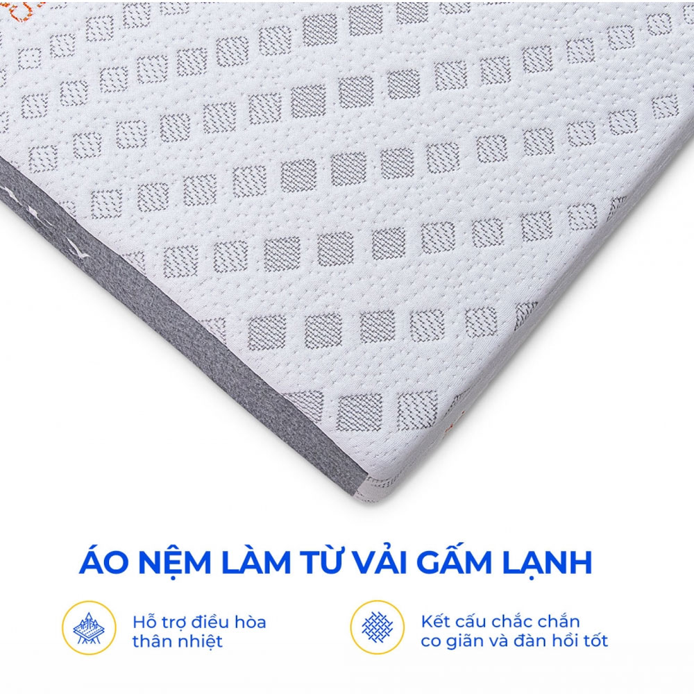 Bề mặt trên: Làm từ vải gấm lạnh cao cấp, mềm mịn, thoáng khí và giúp mang đến cảm giác mát mẻ dễ chịu ngay khi chạm vào.
