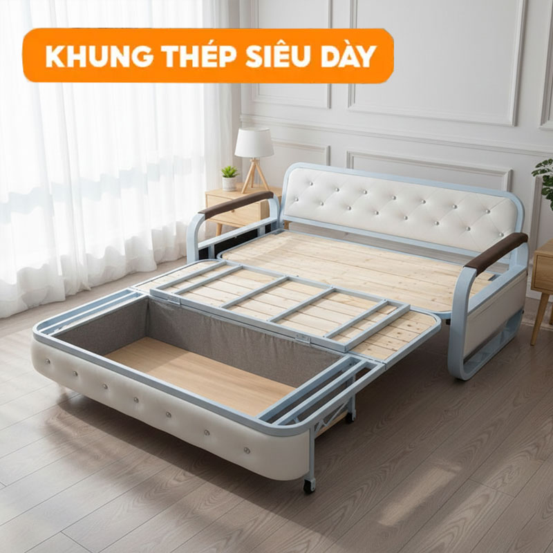 - Phần khung sườn thép dày chịu lực tới 300Kg, nhiều lớp đỡ không bị trũng khi nằm lâu.