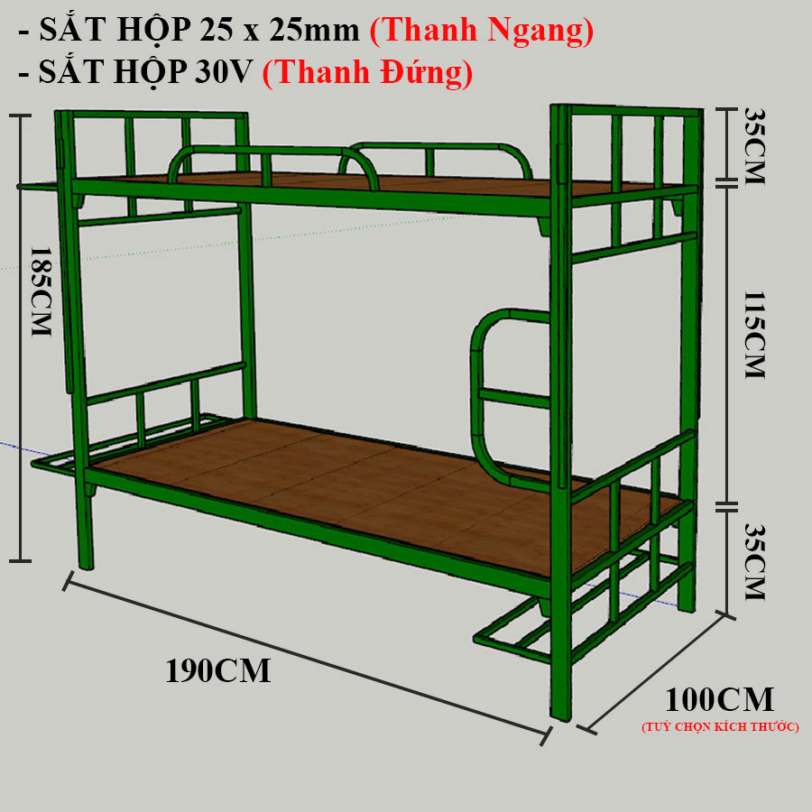 Kích Thước: D x R x C (190 x 100 x 185cm ).Sơn tĩnh điện màu xanh Quân Đội .Vật liệu: Sắt hộp Chữ Nhật, Hộp Vuông 25 x 25mm