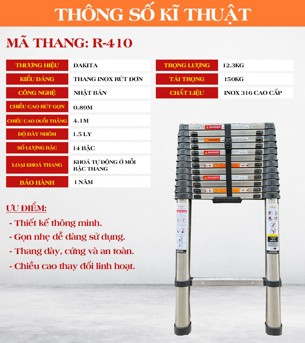 Thang Inox Rút Đơn DAKITA R-410 (4.1M) [INOX CHÍNH HÃNG - BẢO HÀNH 1 NĂM]