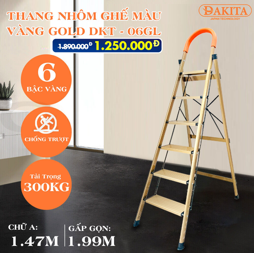 Thang Nhôm Ghế Vàng Tay Vịn Bản To DAKITA GOLD, Khung Nhôm 100% Sơn Tĩnh Điện