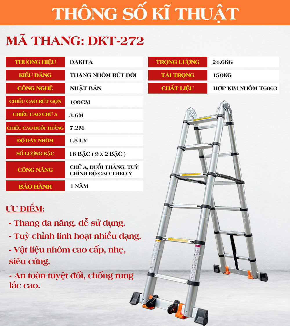 THÔNG SỐ KĨ THUẬT THANG NHÔM RÚT ĐÔI DKT-272